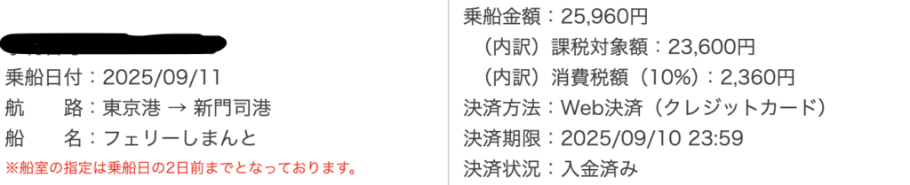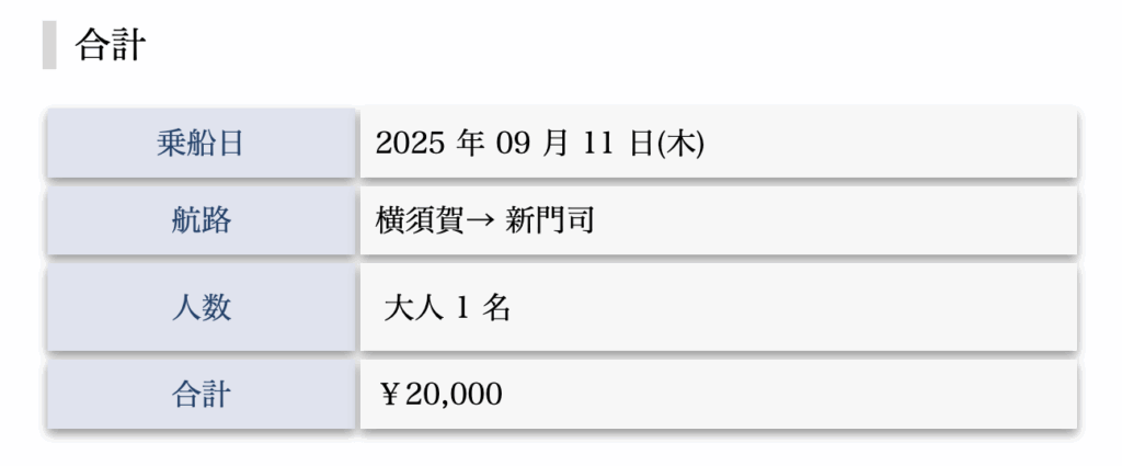 これは2025年9月11日の横須賀→新門司行きの「東京九州フェリー」の金額です↓